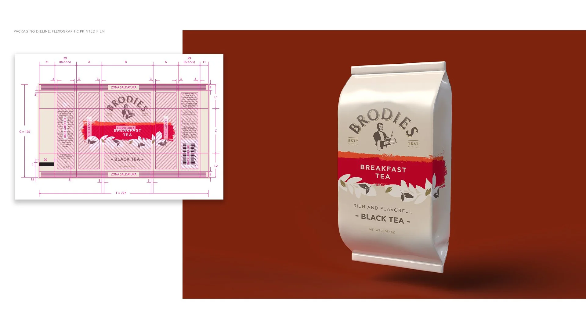 The client needed existing retail packaging adapted to application in foodservice. We reconfigured the design for seven color flexographic printing, using dielines for the tubular gusseted packaging on registered film that matched the other products in the line. From there, we designed a label for digital print.