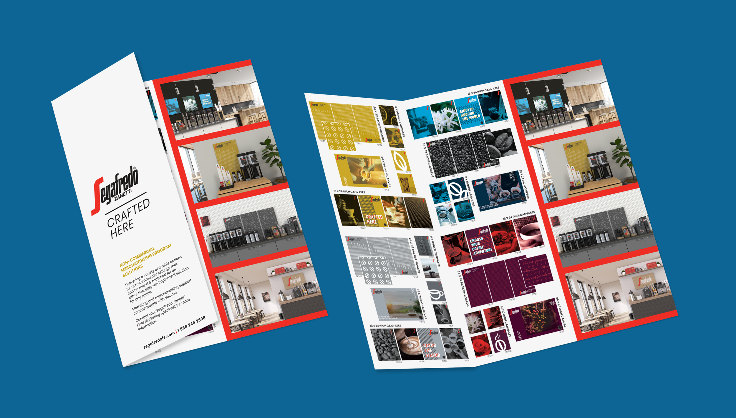 Fine Tooth worked with Segafredo Zanetti’s marketing team to overcome this lag in awareness and communicate the brand in account to help drive home purchase. Obstacles were many, particularly an infinite array of service setups that the division was solving on a case by case basis. The team wanted to break this time-consuming cycle of designing and producing a lot of custom pieces with a flexible, cost effective solution.
